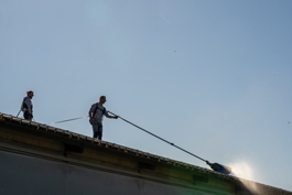 Per esempio l’utilizzo della doppia spazzola rotativa Kaerker e aste telescopiche che permettono di raggiungere i tetti senza dover noleggiare piattaforme.